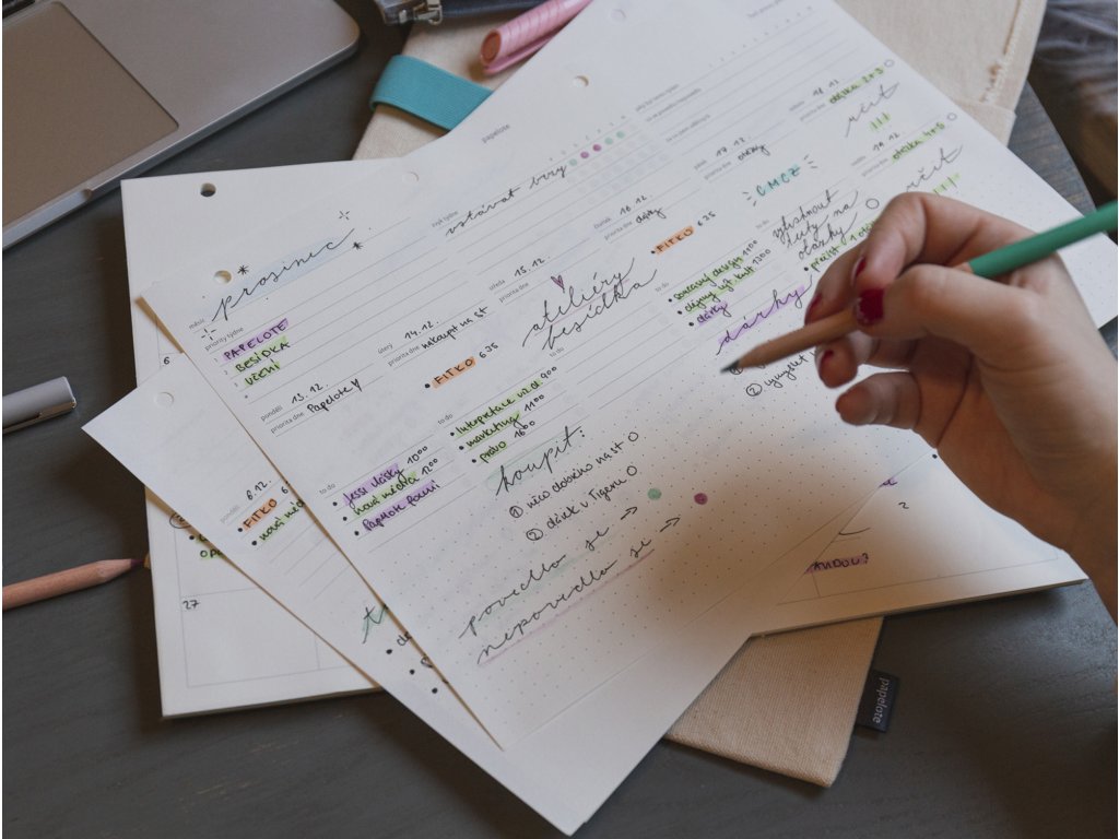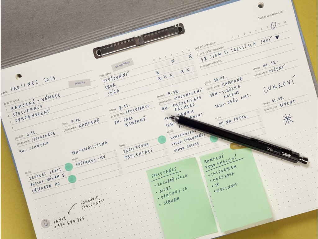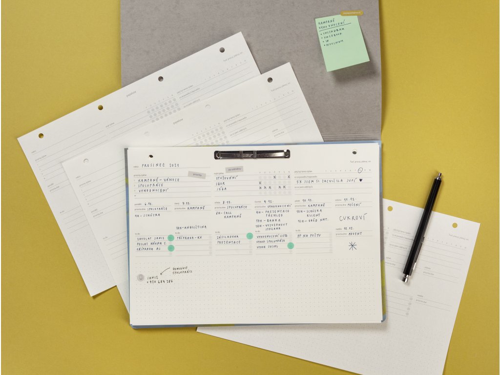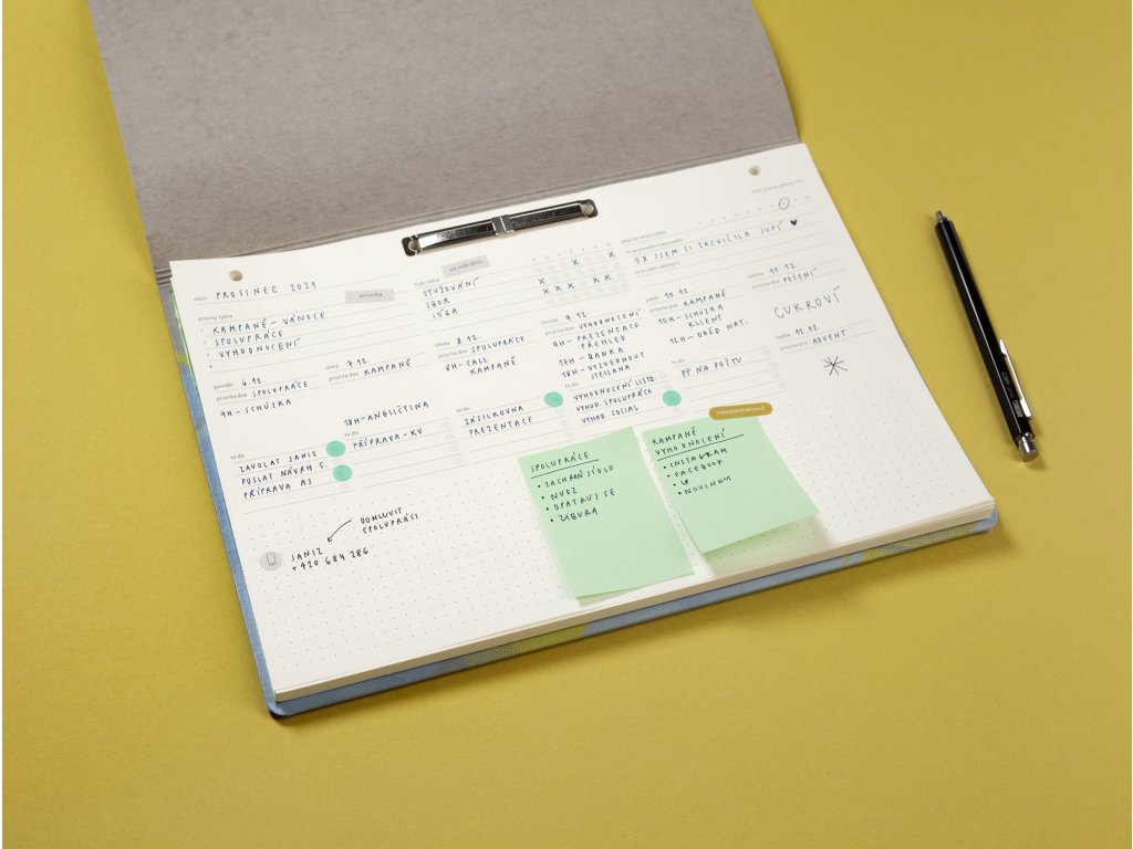 - kam s ním: plánovač funguje efektivně, když na vás číhá každý den na stole, ale hodí se také např. k dalším dokumentům do našich odolných desek z veganské kůže