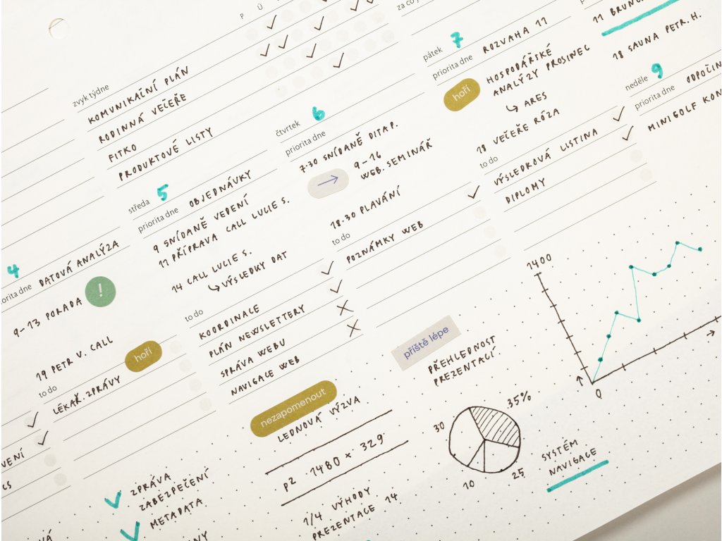 - funkce: předtištěný plánovač vám pomůže určit si priority dne a týdne, pěstovat si správné návyky, vyhodnotit úspěchy a neúspěchy a v neposlední řadě si pečlivě zapisovat to do list